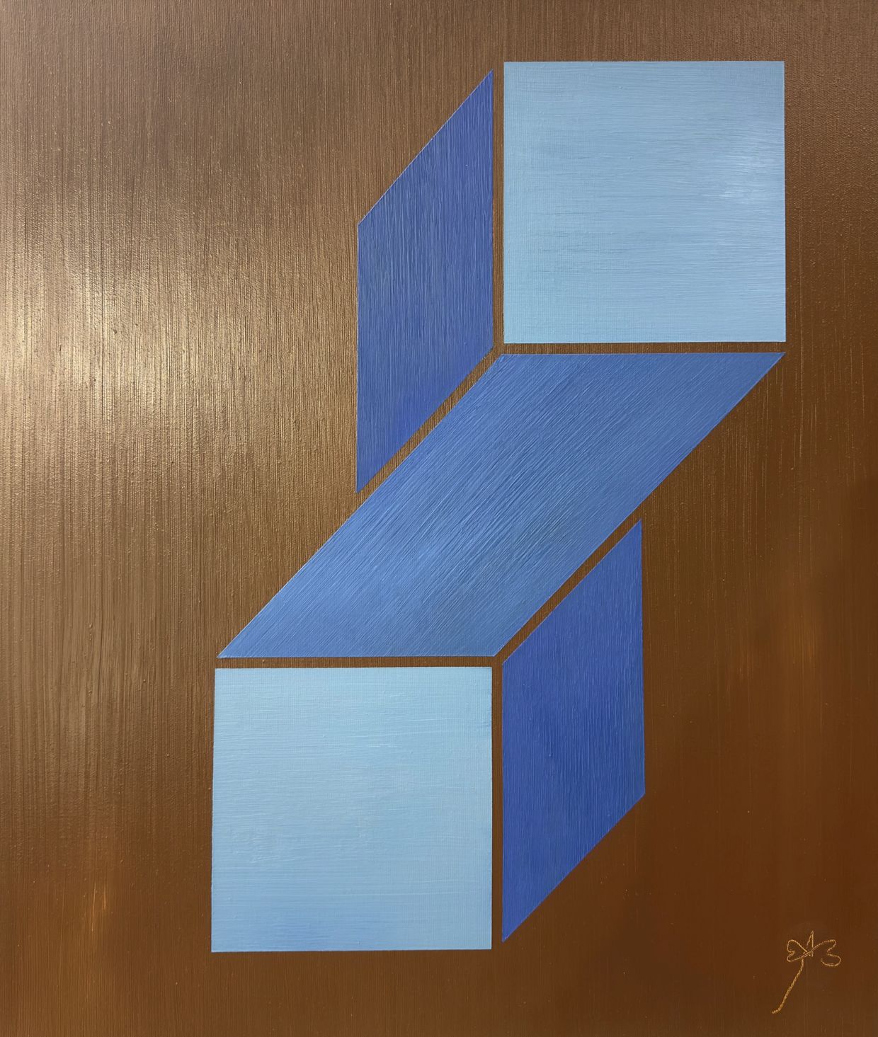 Chromatically, Binary operates with surgical restraint. Pale ice blue and deep cobalt articulate the three-dimensional illusion, while the metallic brown ground acts as both void and vessel—earthly, architectural, and strangely timeless. The brown base, composed through an intricate layering of gesso, black, and white underpainting before final application, shimmers subtly under light, evoking the sense of aged copper or brushed bronze. The blues, on the other hand, feel weightless—optical zones of clarity floating atop an ancient substrate. This chromatic opposition mirrors the painting’s conceptual one: a dialogue between grounded materiality and the abstract realm of thought.