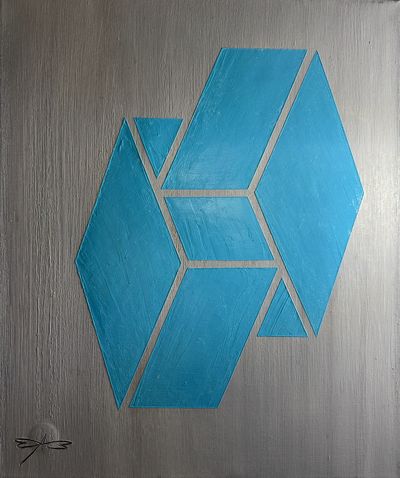 Two mirrored prisms interlock without touching, suspended in a field of metallic grey. They suggest polarity, argument, even conflict — yet are arranged with such compositional poise that opposition becomes symmetry. Babos uses geometry not to separate, but to fuse. This is the crux of Congruity: the possibility that dualities — truth and falsehood, love and hate, structure and freedom — might inhabit a shared space without annihilating one another.