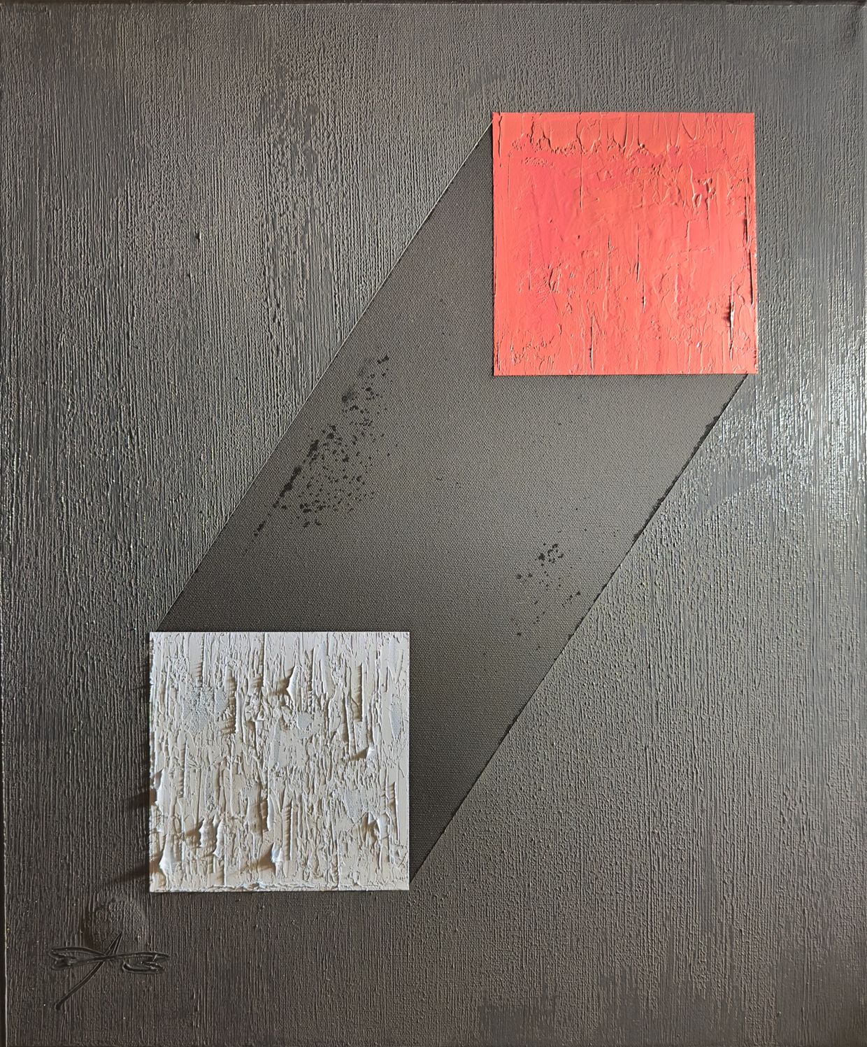 Dilemma is a distilled confrontation with the paradox of choice. Executed with calculated precision and conceptual boldness, the work belongs to Tibor Babos’s Geminimal collection and operates as a keystone in his practice of Paradox Constructivism—a style that subverts the rational language of geometric minimalism to reveal existential contradiction. Two impastoed squares—one a vivid salmon, the other a ghostly white—are suspended in silent opposition, joined and divided by a dark trapezoidal void. What first appears as a sharply constructed optical illusion unfolds into something far more metaphysical: an impossible object whose geometry stages the very condition of dilemma.