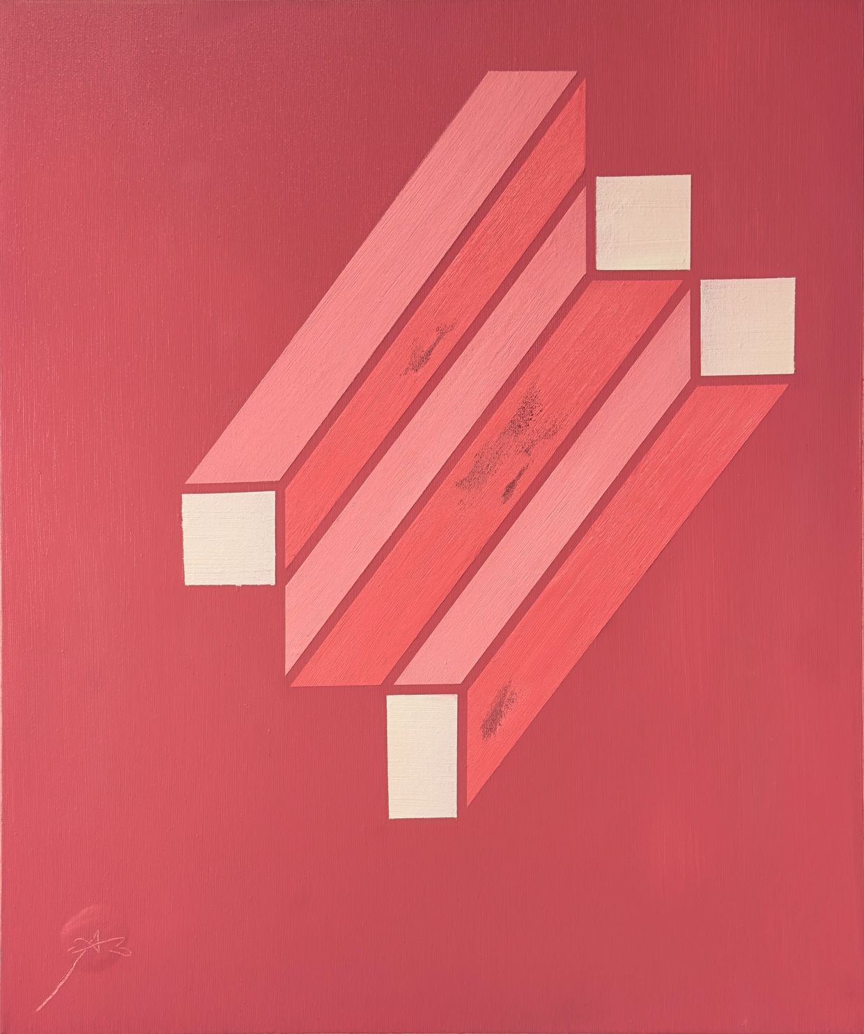The work’s visual impact lies in its sharp restraint. Three elongated prisms stretch diagonally across a red field, each one rendered in subtly shifting shades of rose and coral. Their chromatic harmony is betrayed by moments of rupture—dark underpainted marks that rise to the surface like bruises beneath the skin. These imperfections are not mistakes but deliberate insertions of doubt, reminders that no system—geometric or ideological—can remain unfractured. The pale faces of each prism, rendered in off-white, further emphasize this fragility. They are the end points of tension: the moment where structure meets its limit.