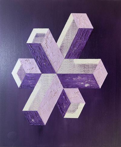 Executed in oil on 3D+ canvas, Six Blocks occupies a liminal space between sculpture and painting. Its surfaces shift between coarse, textured panels and smooth, satin-like planes. The texture is deliberate — not decorative, but architectural. Some surfaces appear chiseled, others almost polished. On certain edges, the raw canvas peeks through, exposing technical drawing lines — a reminder that beneath every illusion lies structure, and beneath every structure, choice.